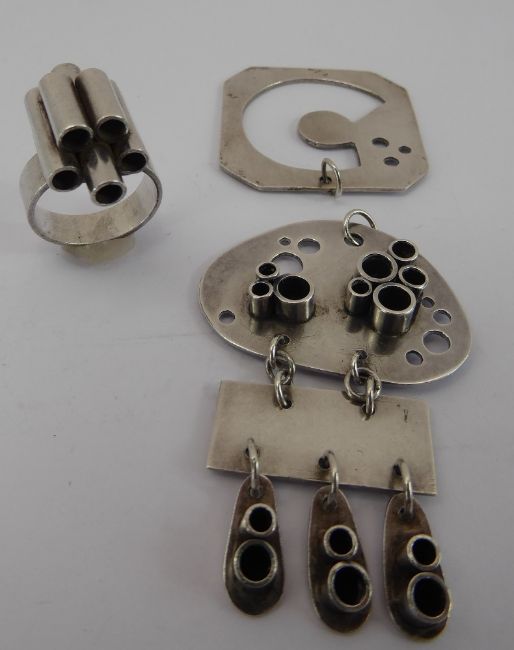 A Bespoke 1960's Tubular Form Ring and Matching Pendant, together with a drop pendant in the form of C, approx 39 gms.