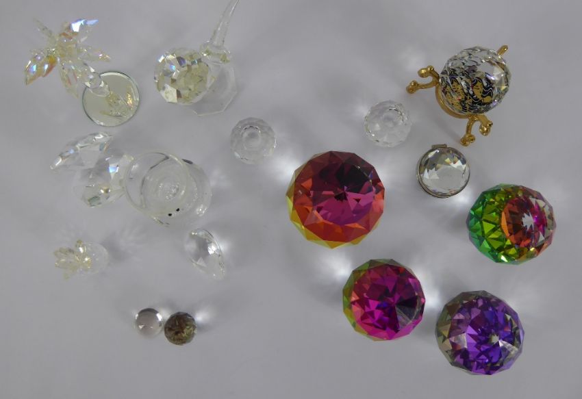 A Collection of Eight Swarovski Style Spheres, together with two candle holders, palm tree, vase, pipe, clam shell and a pineapple. (15)