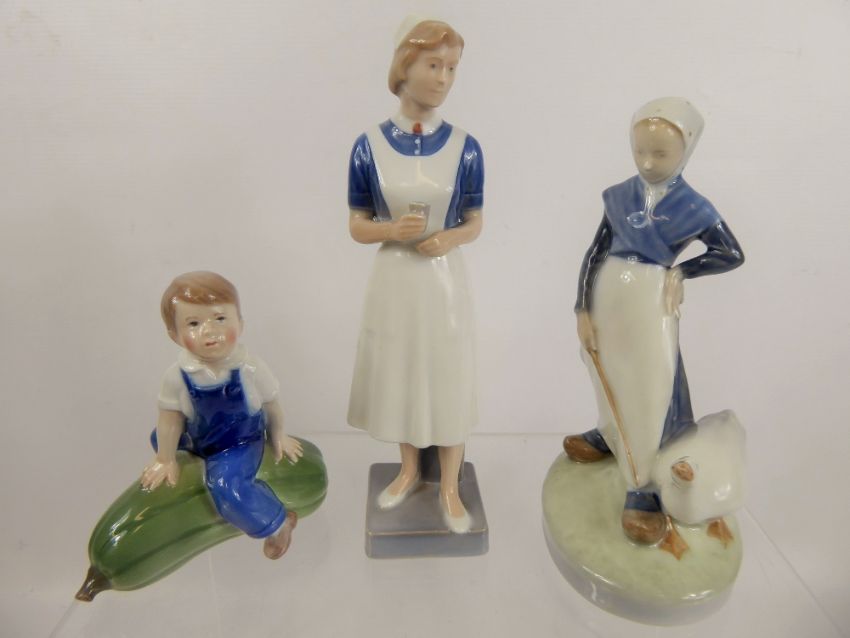Three Royal Copenhagen Porcelain Figurines, entitled 'Goose Girl' numbered 528, approx 19 x 11 cms, 'The Nurse' numbered 4507, approx 21 x 6 cms 1132, and 'Boy with Gourd' numbered 153, approx 12 x 11 cms.