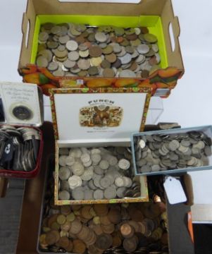 Miscellaneous Coins, including a box of mixed 'All World', Box of 'GB Copper' including farthings, halfpennies, pennies and threepenny bits, box of GB silver metal coins including sixpences, half crowns, shillings. A box of post 1920's threepenny bits and sixpences together with a box of mixed crowns.
