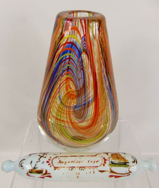 A Murano Style Multi-Coloured Tear Form Glass Vase, approx 30 cms h together with a Victorian glass rolling pin depicting a sailing ship and anchor, approx 32 cms (2)