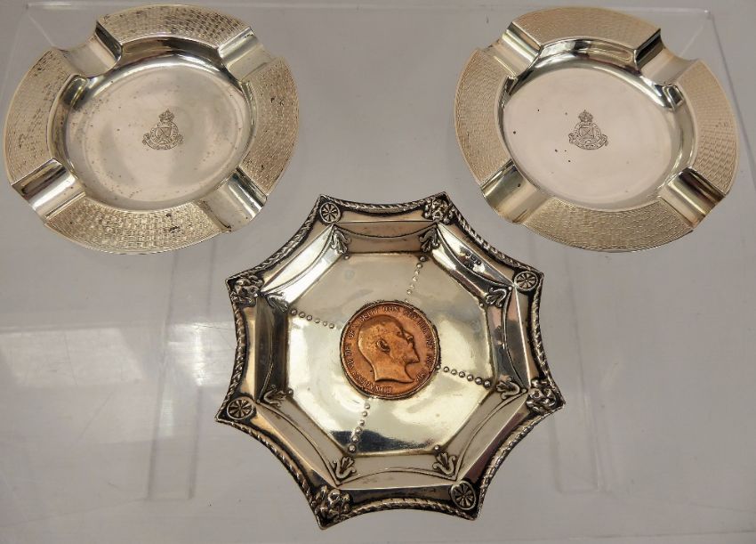 A Pair of Silver Royal Ashdown Forest Golf Club Ashtrays, Birmingham hallmark, mm Mappin & Webb together with a silver pin dish with a one penny insert. (3)