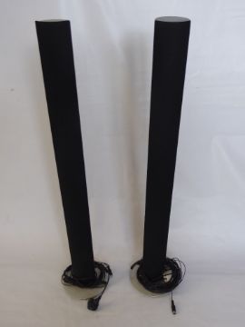 A Bang & Olufsen Beovision Avand 32 TV/DVD, type nr 8463, item nr 1844447, SN 18075492, together with a Beosound Overture DVD type nr 2367, SN 11566534, Beochord V8000 VHS Machine type nr 14609 SN 17905175 together with six BeoLab 6000 Speakers type nr 6822, SN 18047042 item nr 1682204 also with two brushed-aluminium three-drawer cabinets, approx 50 x 42 x 42 cms.