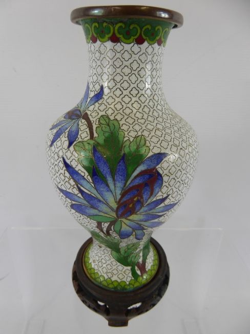 A White Chinese Cloisonne Vase, depicting tree peony, approx 22 cms together with a Famille Rose miniature vase, depicting butterflies and hanging fruit. (2)