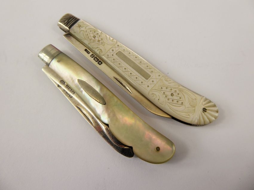 Two Mother of Pearl Fruit Knives, silver pocket knife, Sheffield hallmark, dated 1899/1900, mm Martin Hall & Co, Sheffield hallmark, dated 1906, mm John Yeomans Cowlishaw. (2)