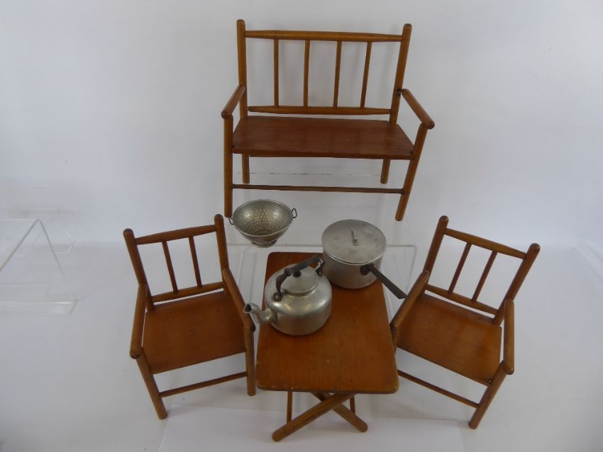A Quantity of Miniature Wooden Furniture, including two chairs, a table and a bench, together with miniature tin kitchen implements including a kettle, colander, pot and cover.