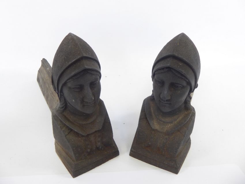 A Pair of French Cast Iron Fire Dogs, possibly depicting the saint Joan of Arc.