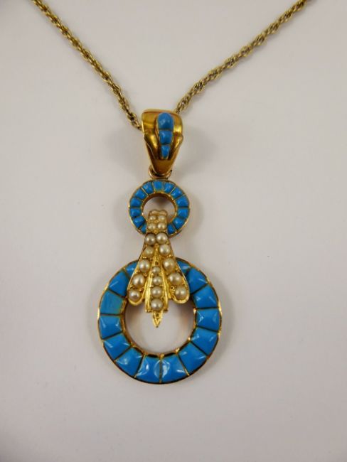 An 18/22 ct Yellow Gold Art Nouveau Turquoise and Seed Pearl Pendant, on a 9 ct yellow gold chain, pendant approx 11 gms, chain approx 6.5 gms. (af)