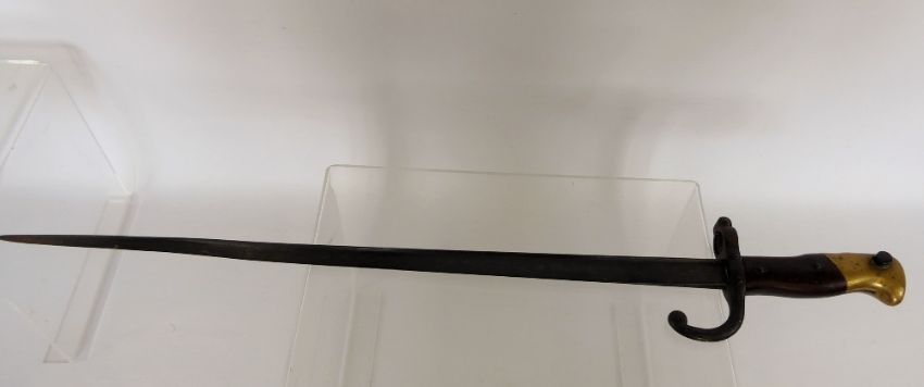 A 19th Century French Bayonet, brass and wood grip, triangular blade, approx 51 cms, no scabbard, etched and dated April 1877.