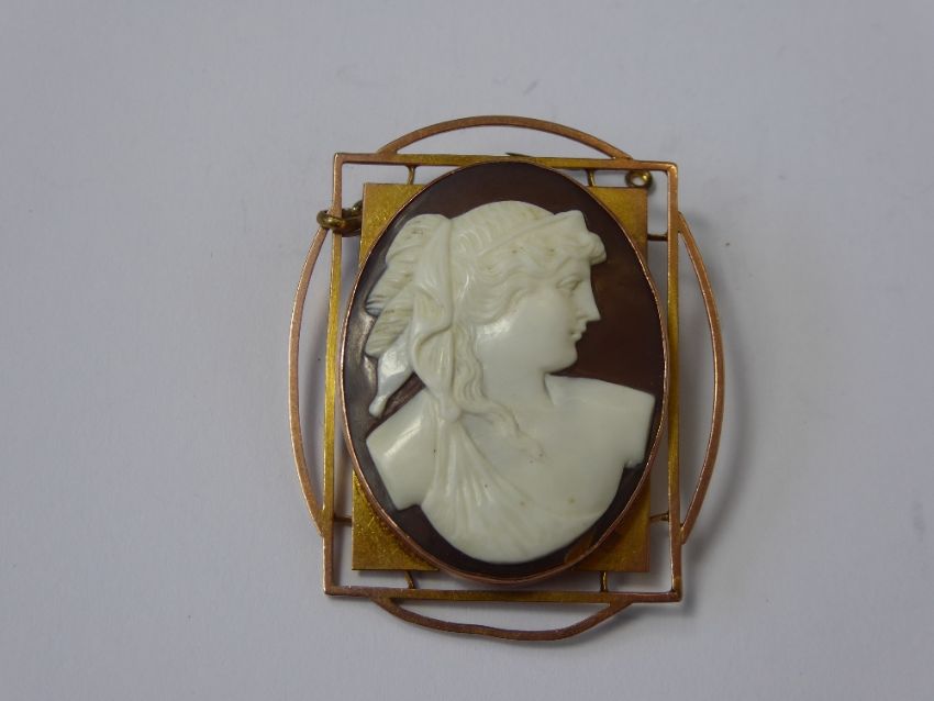A 9ct Rose & Yellow Gold Cameo Brooch, set in an Art Deco setting, depicting a classical profile, approx 35 x 27 mm, approx 10 gms.