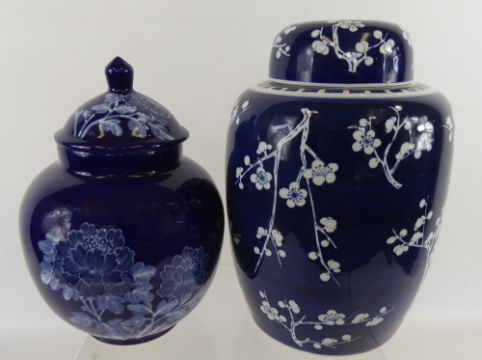 A Taiwanese Blue and White Ginger Jar and Cover, depicting prunus blossom, approx 45 cms high together with a Taiwanese Blue Ginger Jar and Cover, depicting white tree peony, approx 29 cms high. (2)