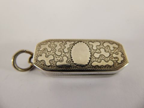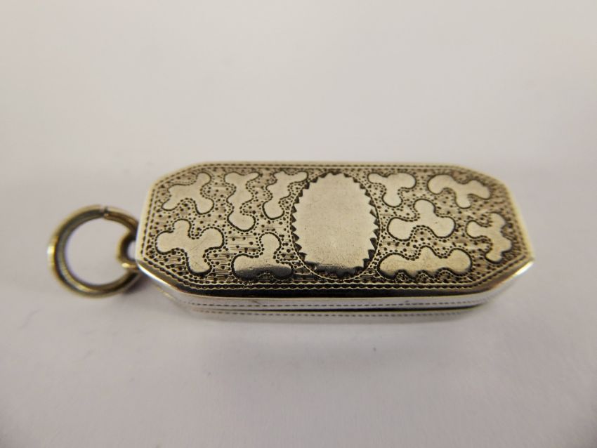 A Silver Georgian Coffin Shaped Vinaigrette, Birmingham hallmark dd 1806, mm J.W. and having gilded interior with cloud design to top and original scent pad.