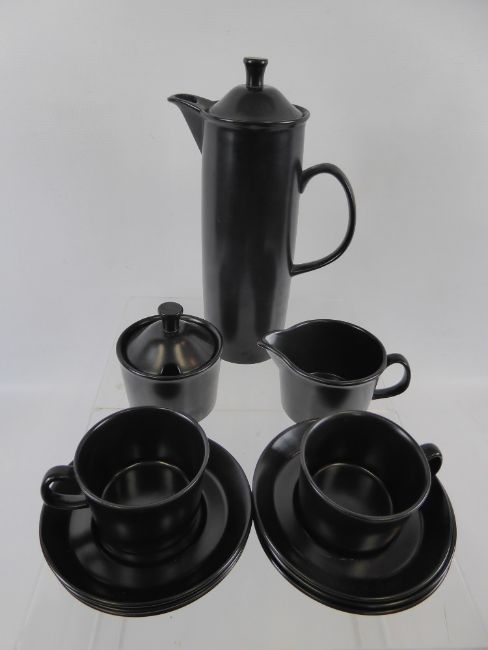 A Black Wedgwood "Eturia" Coffee Set, comprising coffee pot, milk jug, sugar bowl, six cups and saucers.