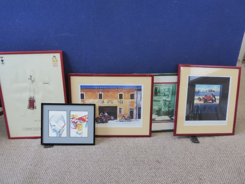 Motor Racing Interest, Sheridon Davies two limited edition prints depicting racing cars and drivers nr 4 of 75 respectively, signed lower right dated 2004, together with a commemorative poster of Ferrari, nr 2558/3000, a photographic print of Enzo Ferrari seated at his desk and a coloured print of Tazio Nuvolari etc.