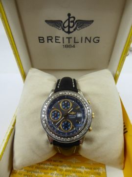 A Gentleman's Stainless Breitling Chronomat Automatic Wrist Watch, with diamond bezel, the watch case nr B13050.1 136078 and having royal blue face with three subsidiary dials each having gold bezel with baton numerals. The primary watch bezel set with approx 45 diamonds approx 1.85 cts, on the original Breitling leather strap, together with box and Breitling carrying case.