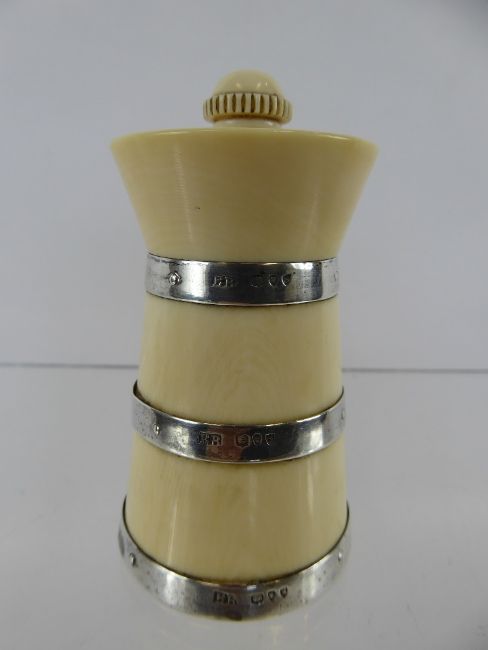 A Victorian Silver Banded and Ivorine Pepper, London hallmark, dated 1893, mm EB, approx 9 cms height.