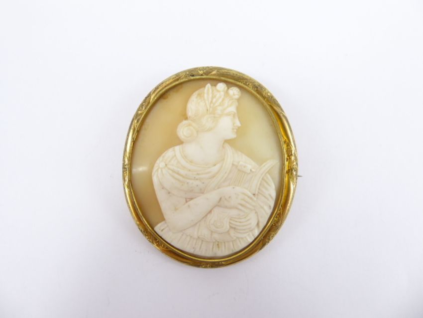 Antique Shell Cameo Brooch, carved with a 'Figure playing the Lute', approx 5.2 x 6 cms, contained within a 14ct yellow gold mount, approx wt. 23.4 gms.