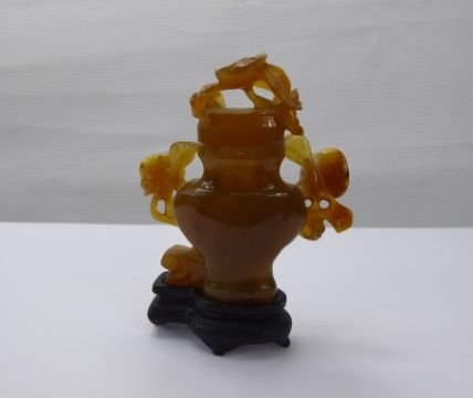Two Hard Stone Chinese Carvings, one a vase with foliate decoration and the other birds seated on a branch. (2)