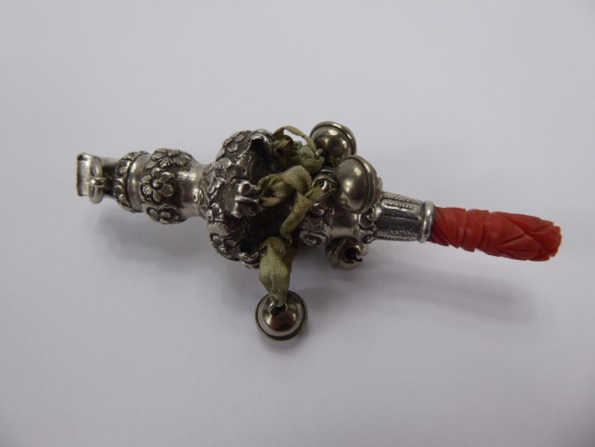 A Victorian Silver Rattle with carved coral handle., mm I.H