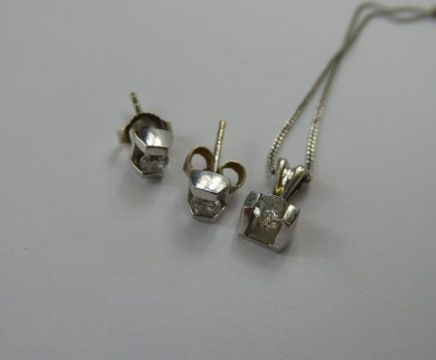 A 14 ct White Gold Diamond Pendant and stud earring set, ear studs approx 18 pts dia, the pendant approx 14 pts dia suspended on a 10 ct fine chain, approx wt 2.7 gms.