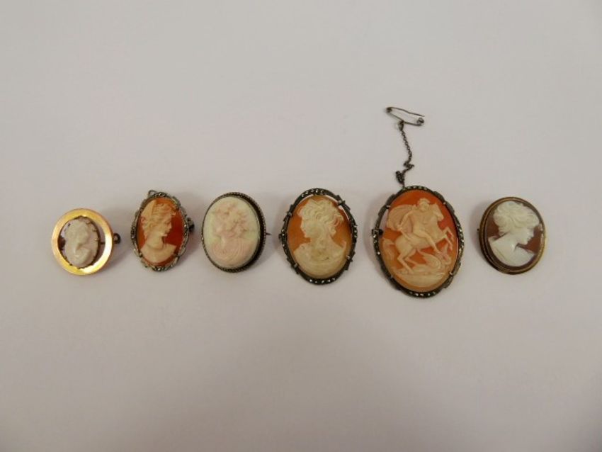 Three Silver and Marcasite Antique Shell Cameos depicting, some in profile, St George and the Dragon (af) together with two silver gilt and one 9ct gold circular (approx wt. 3.2 gms). (6)