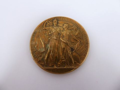 An Adolf Weinman 1904 St Louis Exposition Bronze Medal, the obverse 'Universal Exposition Saint Louis United States of America MCMIV', depicting a feminine figure sheltering a native American girl, with a bald eagle to the other, approx 6.4cm dia. This coin commemorates the Louisiana Purchase, which dramatically broadened the territories to the American west.