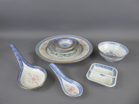 A Chinese Part Dinner Service, comprising four large plates, four shallow bowls, four saucers, four small bowls, one large serving bowl, eight rice bowls, two square sauce boats, four porcelain spoons, one porcelain serving spoon, one small crouching figure.