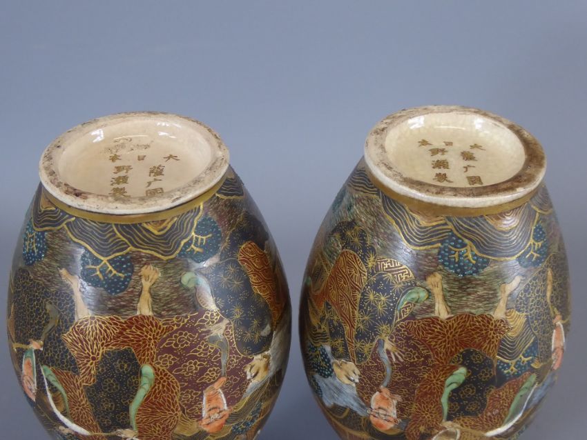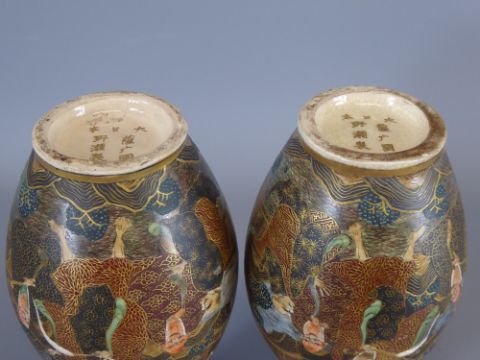 A Pair of Late 19th Century Satsuma Bottle Vases, of typical palette, hand painted raised dragon design, approx 15 cms, character marks to base.