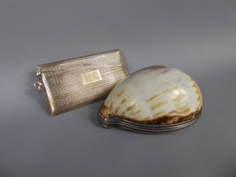 A Silver Engine-Turned Card Case, Birmingham hallmark, dated 1922, mm CSC & Co, monogrammed HC, approx 39.6 gms together with a silver metal and cowrie shell table snuff box (2)