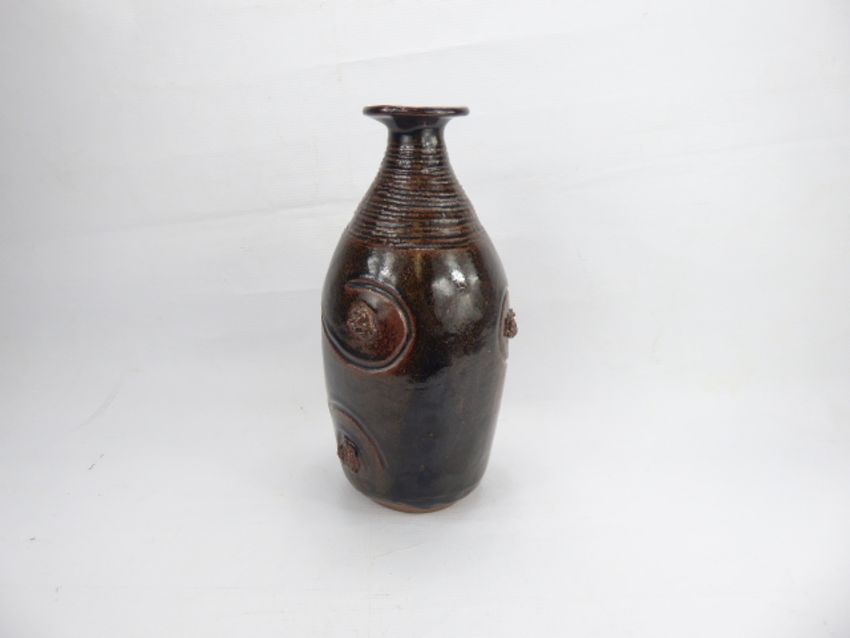 R. Higgs Studio Pottery, brown glazed pottery vase with incised decoration and knots in relief, approx 30 cms, monogram to base, together with a R. Higgs Studio Pottery, brown glazed vase, with daisy's in relief, approx 27 cms, with monogram to base. (2)