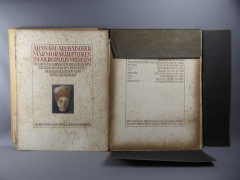 Hans Schrader entitled 'Auswahl Archaischer Marmor Skulpturen Im Akropolis Museum', a selection of prints depicting sculptures at the The Acropolis Athens, published in Vienna 1908 by A. Holder.