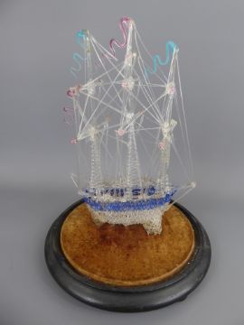 A Delicate Victorian Nailsea Glass Ship, in the form of a three masted ship, all under a glass dome and on an ebonised base, approx 54.5 cm high, 56.3 cm wide.