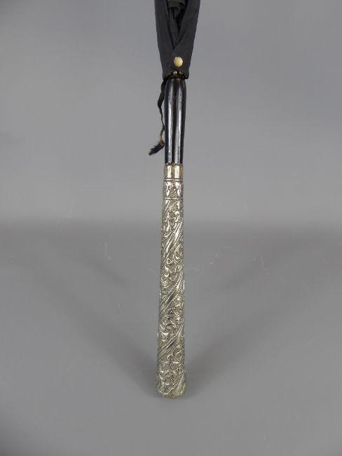 An Elegant Victorian Silver Topped Black Parasol. The parasol fabric depicting gold lilies and the silver handle a floral design, approx 84 cms long.
