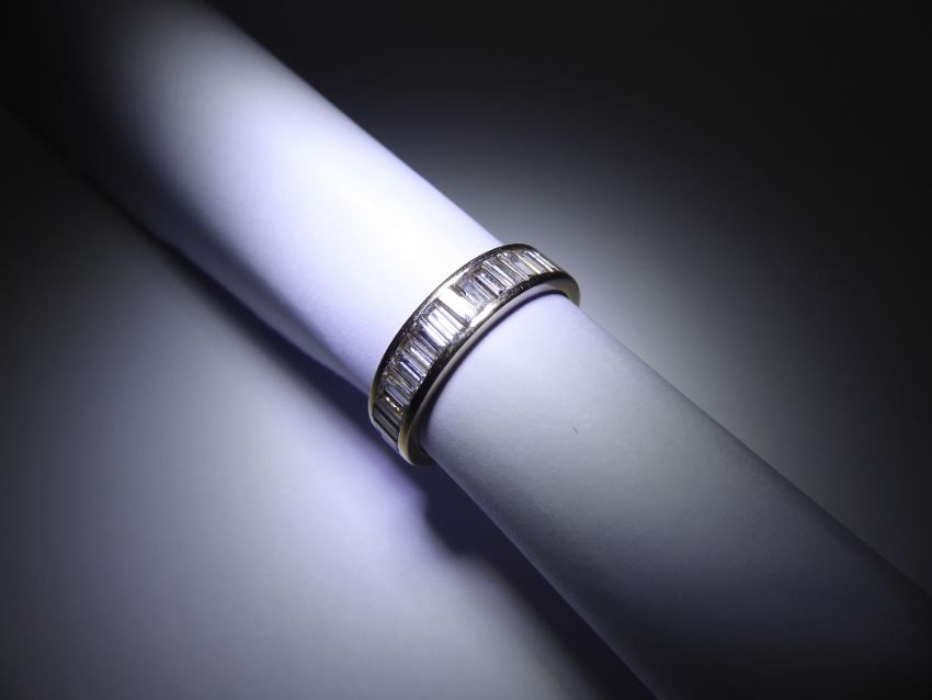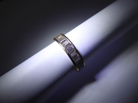A Lady's 18ct Yellow Gold Diamond Full Eternity Ring, the ring set with forty three baguette cut diamonds approx 3 x 1mm, and 2.35 cts, colour I - J, clarity VS, size M, approx 2.8 gms.