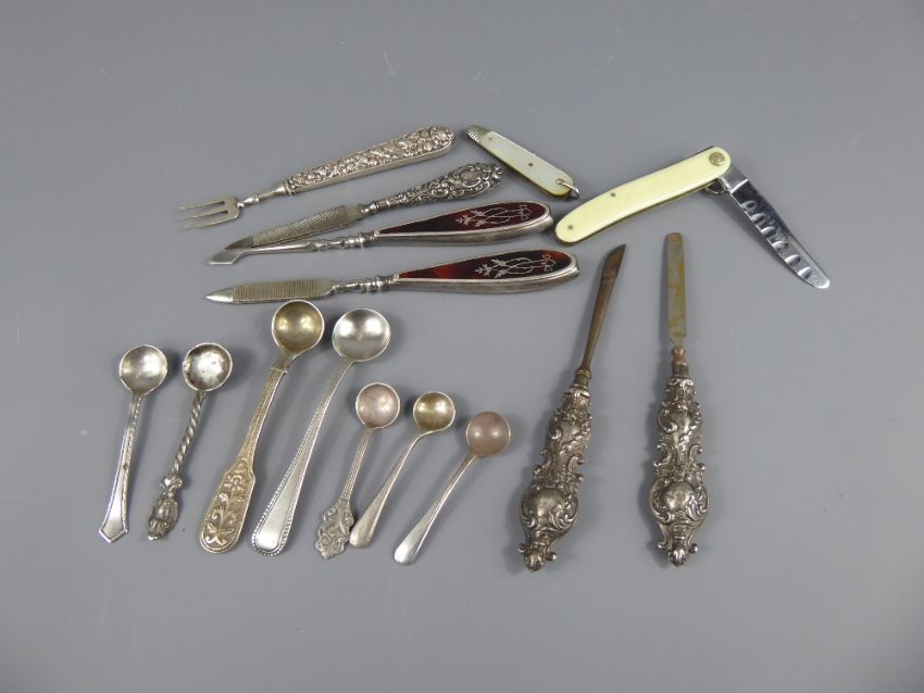A Quantity of Silver Salt and Mustard Spoons, approx 75 gms, together with Silver Handled Manicure Items, including mother of pearl and tortoiseshell.
