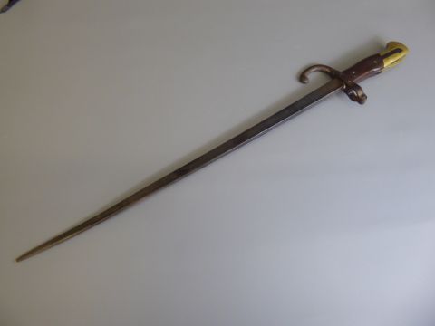 A 19th Century French Bayonet, brass and wood grip, triangular blade, approx 51 cms, no scabbard, etched and dated April 1877.
