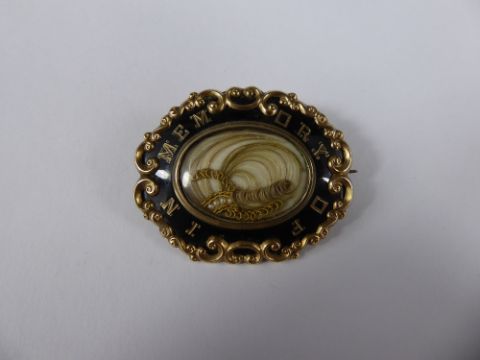 A Victorian 9 ct Yellow Gold and Enamel Mourning Brooch/Pendant, the brooch dated 1866, approx 42 x 34 mm, approx 13.3 gms.