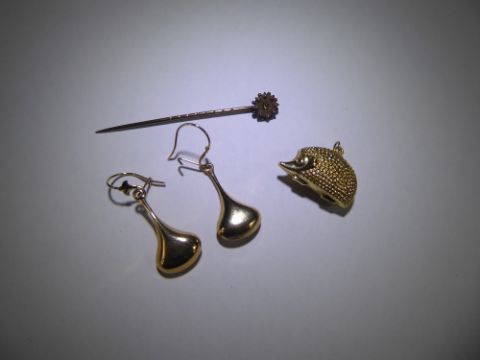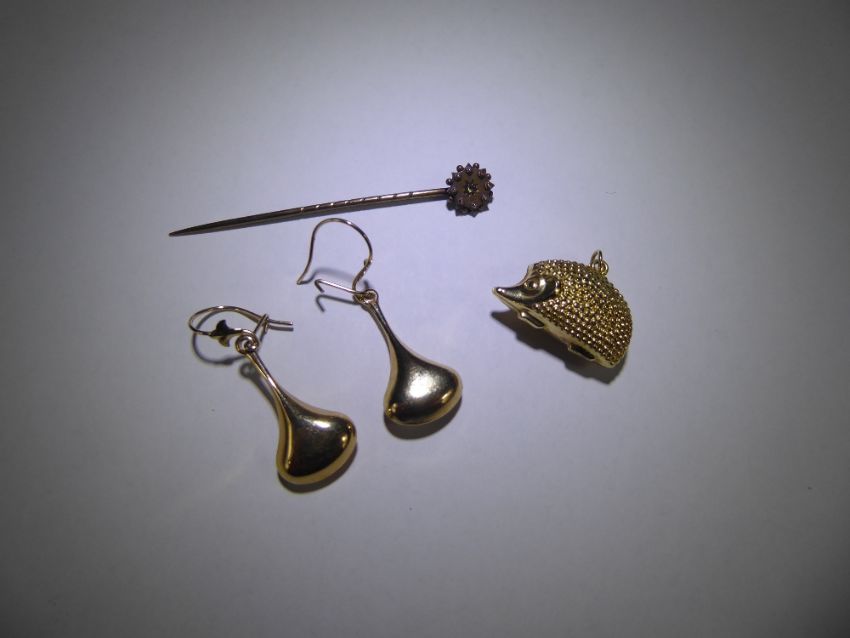 A Pair of 9ct Gold Hedgehog Earrings and Charm, approx 3.2 gms together with a gentleman's 9 ct yellow gold and rose cut diamond tie stick. (4)