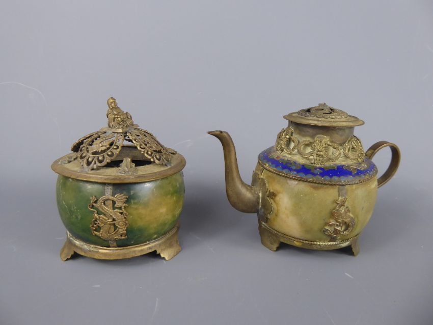 A Vintage Antique Chinese Hard-Stone, White-Metal and Cloisonne teapot depicting dragons, character marks to base, approx 10 cms (af) together with a hard-stone and white-metal incense burner, depicting dragons, frogs and Buhdda finial to cover, character marks to base, approx 9.5 cms.