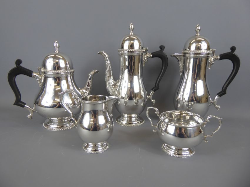 A Five Piece Silver Tea and Coffee Set, comprising tea pot, coffee pot, hot water pot, sugar bowl and milk jug, approx 2088 gms, Sheffield hallmark, dated 1978, mm Sterling Silver Ltd.