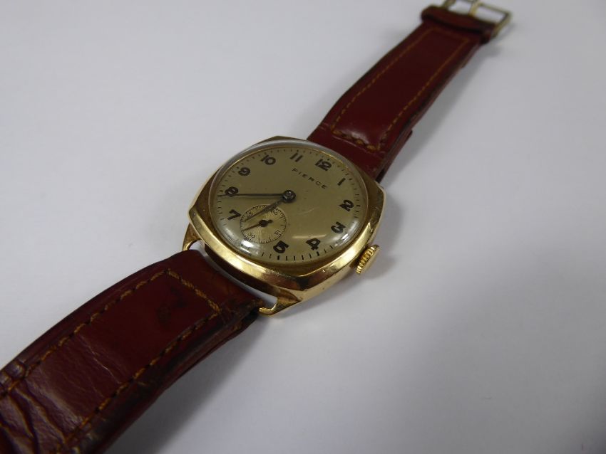 A Vintage Gold Pierce Swiss Made Wrist Watch, the watch case inscribed 'Presented to E.S Taylor Esq by MacFisheries Ltd for long service, on brown leather strap. Cream face with numeric dial, approx 28mm incl. winder, in the original jewelers box.