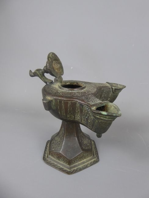 A 13th Century Khorassan Bronze Double Spouted Oil Lamp, with hinged bird cover on a hexagonal base. (af)