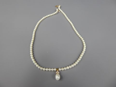 tear drop pearl with three diamonds above, pearl approx 8 x 6 mm.