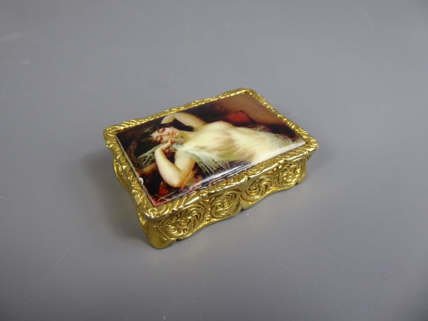 A Vintage 18ct Gold-Plated Pill Box with a hand-painted miniature portrait of a reclining nude lady (possibly Italian).