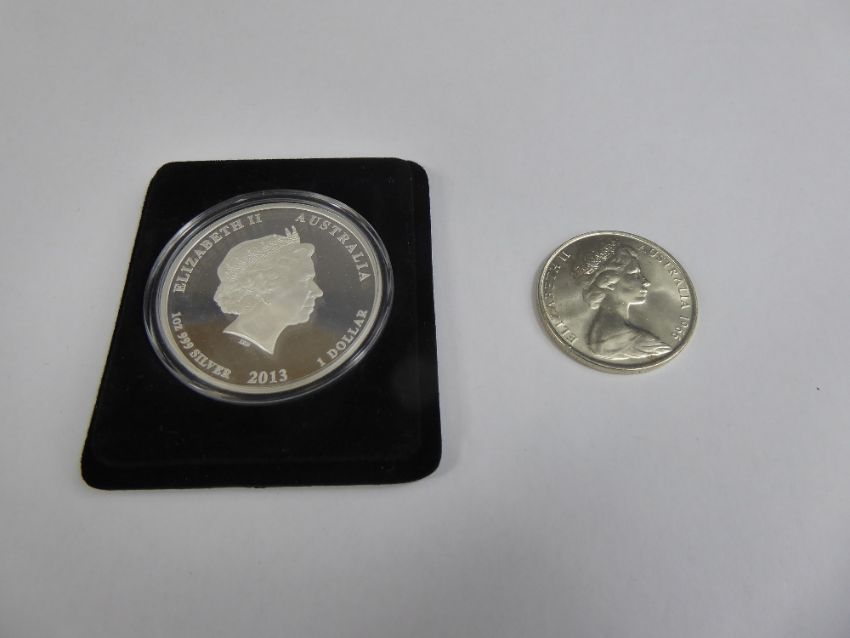 An Australian Proof Silver Crown of one Troy oz., issued to celebrate the birth of Prince George of Cambridge in 2013. in the original Perth Mint packaging with certificate nr 3528 10000, together with an un-circulated silver 1966 50 cent coin, the only silver coin Australia has issued to date, for general circulation. (2)