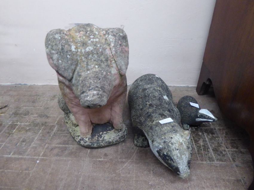 Three Composite Stone Garden Figures, the first being a seated pig, approx 50 x 24 x 40 cms and a badger and cub. (3)
