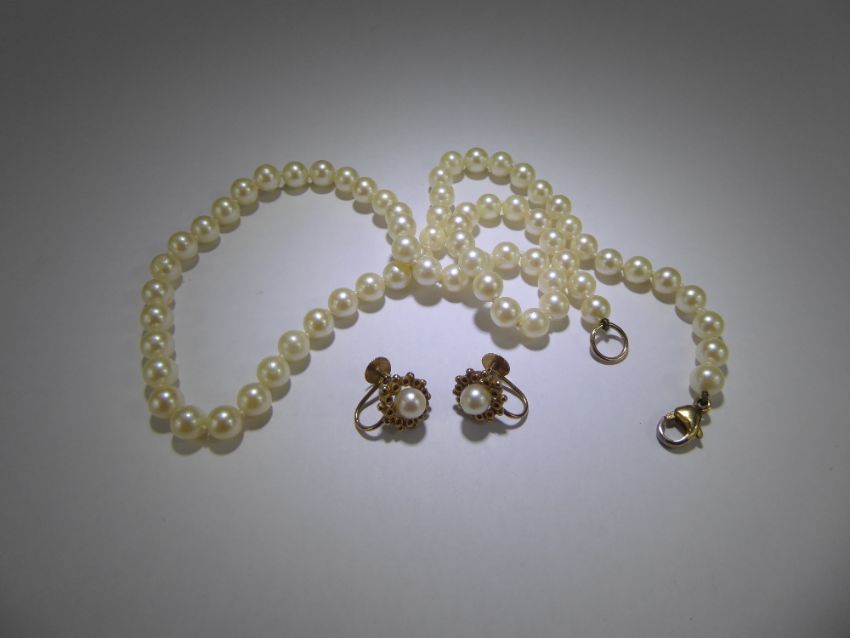 A Vintage Cultured Pearl Necklace, 9ct gold clasp. The pearls approx 5 mm, approx 44 cms long, together with a pair of 9ct gold pearl earrings.