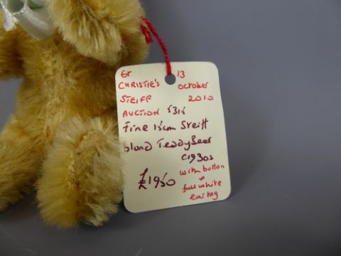 A Circa 1930's Steiff White Teddy Bear, with original button and full white ear tag, approx 15 cms, this Steiff bear features a long blond mohair coat, jointed limbs with black stitched muzzle and brown eyes and sporting a blue ribbon.