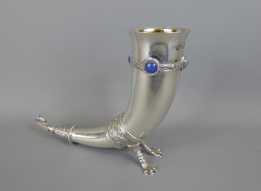 A Silver Toasting Horn, the horn inset with blue cabachon stones, mm A E Jones, Birmingham hallmark, dated 1977, approx 480 gms.