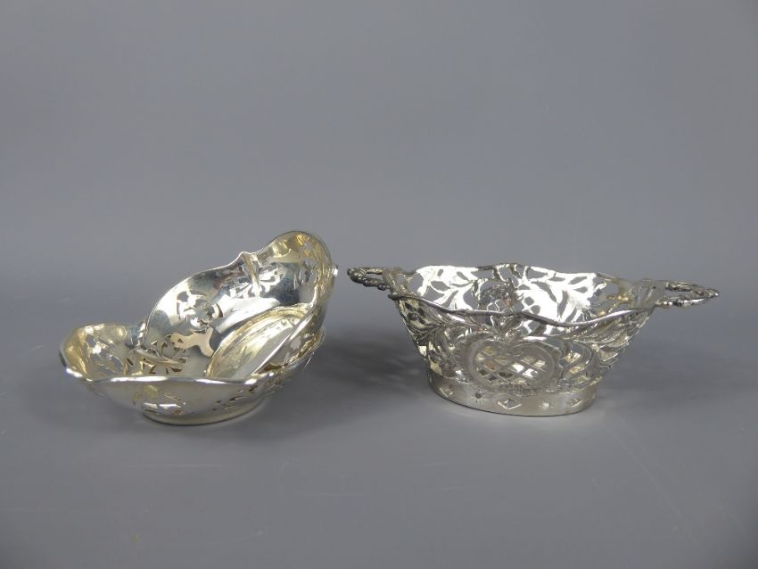A Continental Silver Trinket Dish, pierced decoration, stamped 925, approx 59.3 gms., together with a pair of silver pin dishes Birmingham hallmark, dd 1925, approx 36.6 gms.